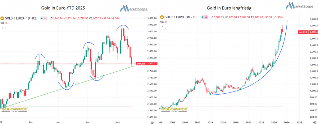 Der Goldpreis in Euro entwickelt sich auch in 2025 exakt so wie prognostiziert und im Goldbericht veröffentlicht. Seit Jahresbeginn klettert der Kurs von Hoch zu Hoch. Dass dies mit einer etwas höheren Volatilität als 2024 sein wird haben wir genau so erwartet und beschrieben.